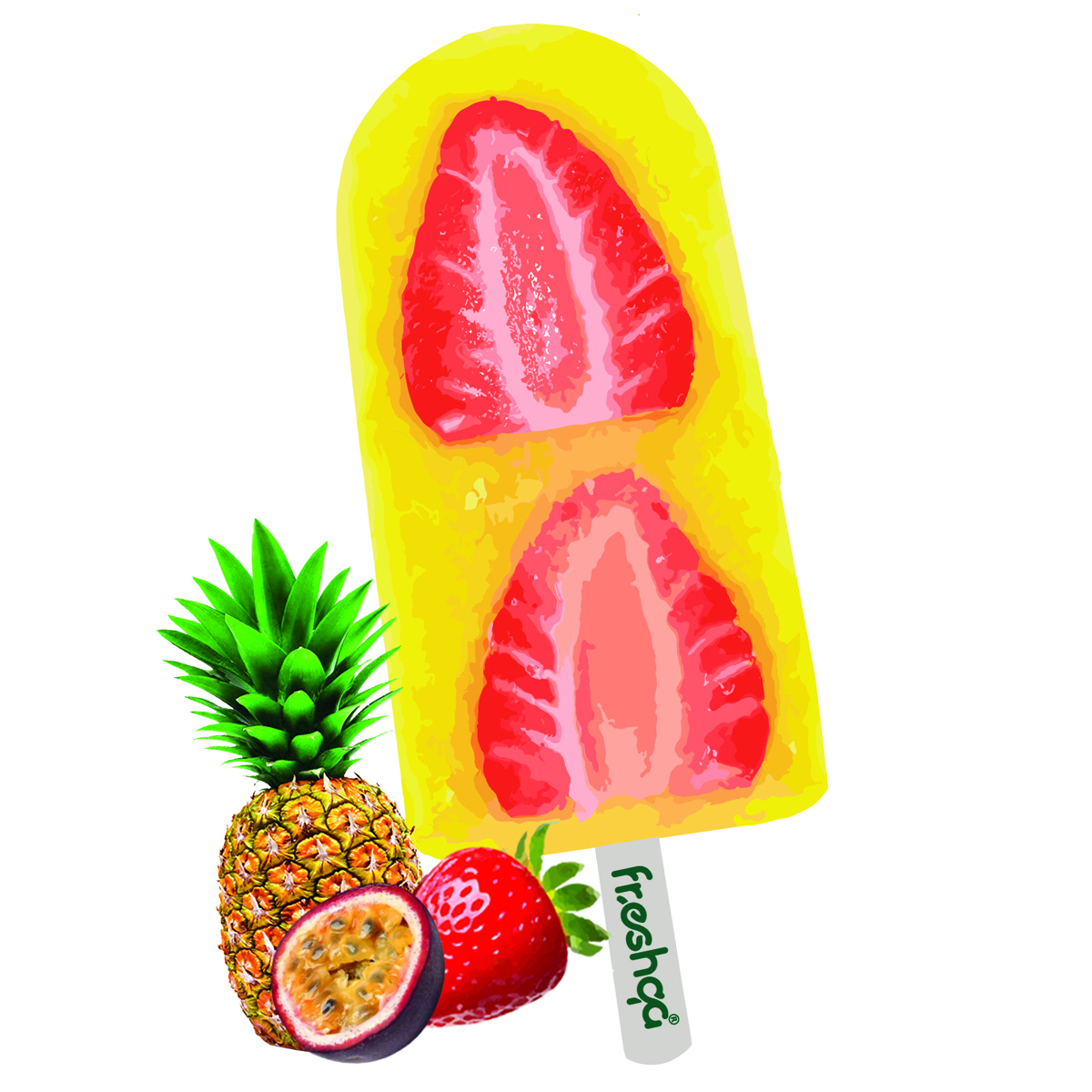 It’s not just traditional ice cream. It is ice pops Sugar-free made from natural Passion, Pineapple fruits, and real strawberry slices, a delightful combination of taste innovation, as we combined traditions with tropical fruits to draw inspiration from the ingenuity of distinction in an artistic painting nourished with natural vitamins for a feeling of satisfaction and complete refreshment of the taste buds with every bite. It will feel like an unparalleled, enjoyable, vibrant symphony of harmony. Indulge in a taste that takes you to childhood memories for a unique experience and sense of taste that will not be repeated except with Freshqa
